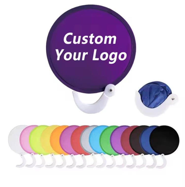 Free Sample Customized Foldable Mini Handheld Fan Collapsible Pocket Nylon Fold Up Hand Fans Round Flying Disc